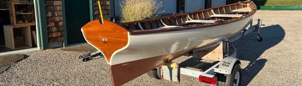 She can be rowed as a single or with two rowers. She comes with 2 pair of beautiful spruce Shaw and Tenney rowing oars and a galvanized trailer modified to properly support her hull.