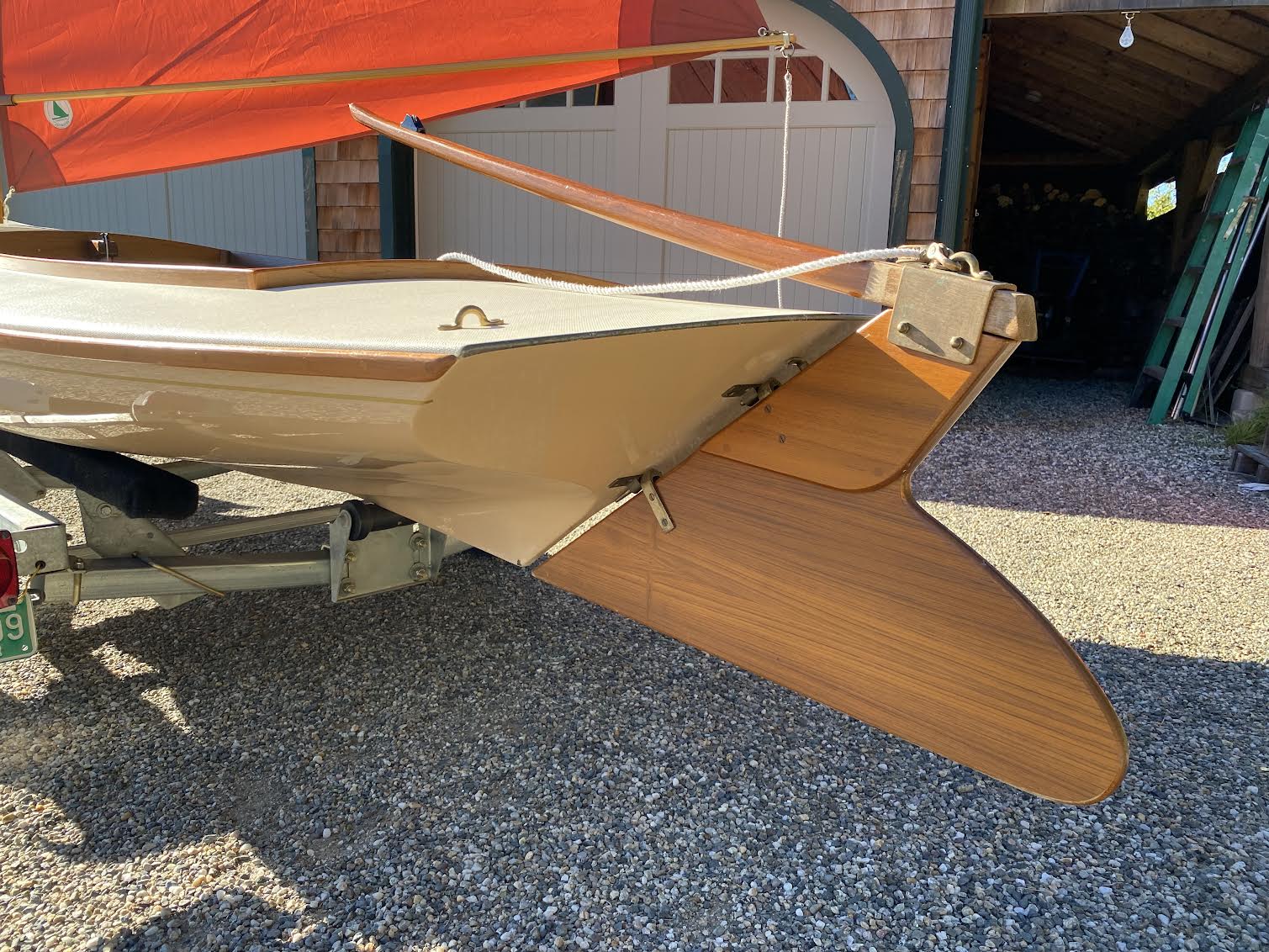 The boat has an Ivory Hull, White Deck and Tanbark Sails and a perfect boat cover made to fit from the manufacturer. The spars are beautifully varnished spruce.