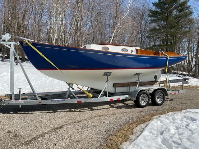 This beautiful 2004 Joel White Designed Bridges Point 24 has been a fresh water boat since new. She is easily the finest BP 24 on the market and includes a 2022 Triad Trailer. Blue hull, red boot stripe, fresh smooth white bottom paint, and new professionally applied Epifanes Varnish.