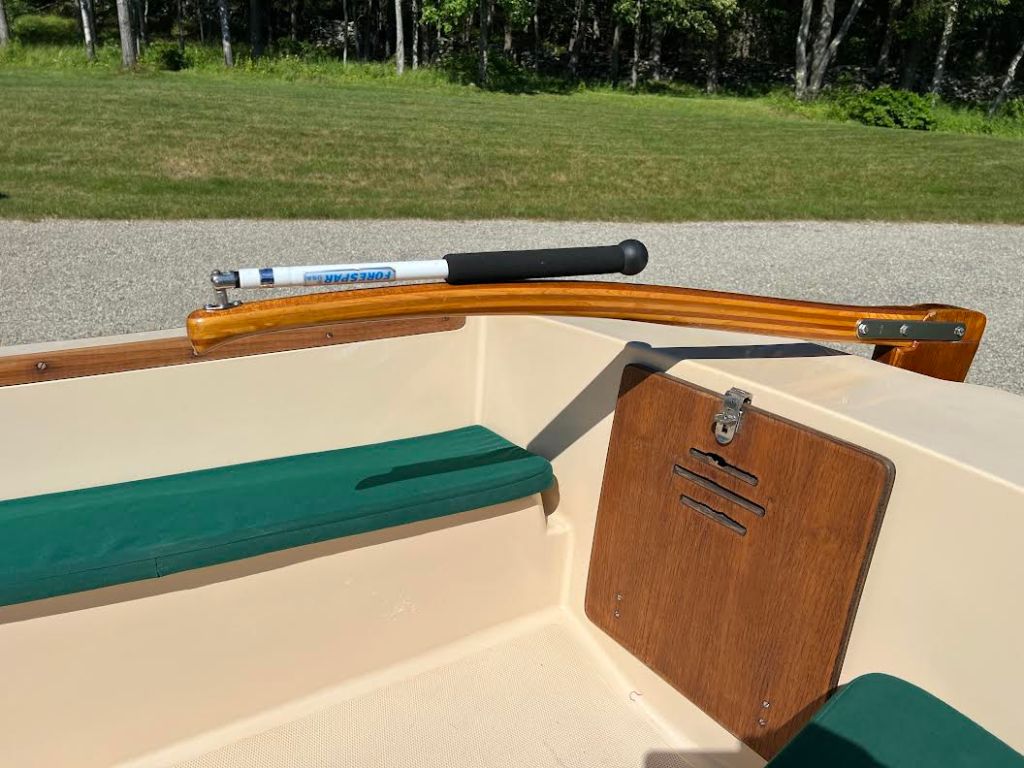 Teak Gunwales with Canvas Covered Rubber Outer Gunwales. Bronze Oar Lock Sockets and Oar Locks, One Pair of Oars, Stainless Steel 3/8 reinforced Towing Eye, Kick Up Rudder, Teak Floor Boards, Bronze Drain, Rainbow Sail, Anodized Two Part Mast and Boom, Ronstan Hiking Stick on Tiller, Kick Up Rudder, Custom Canvass Boat Cover with Supports, Custom Spar Bag, Protective Stainless Steel Transom Molding, 3 Lifting Eyes, Lifting Bridle, Teak Breast Hook and Quarter Knees, Teak Center Thwart/Seat and Fore and Aft Flotation Chambers. You are looking at a Trinka in New Condition.